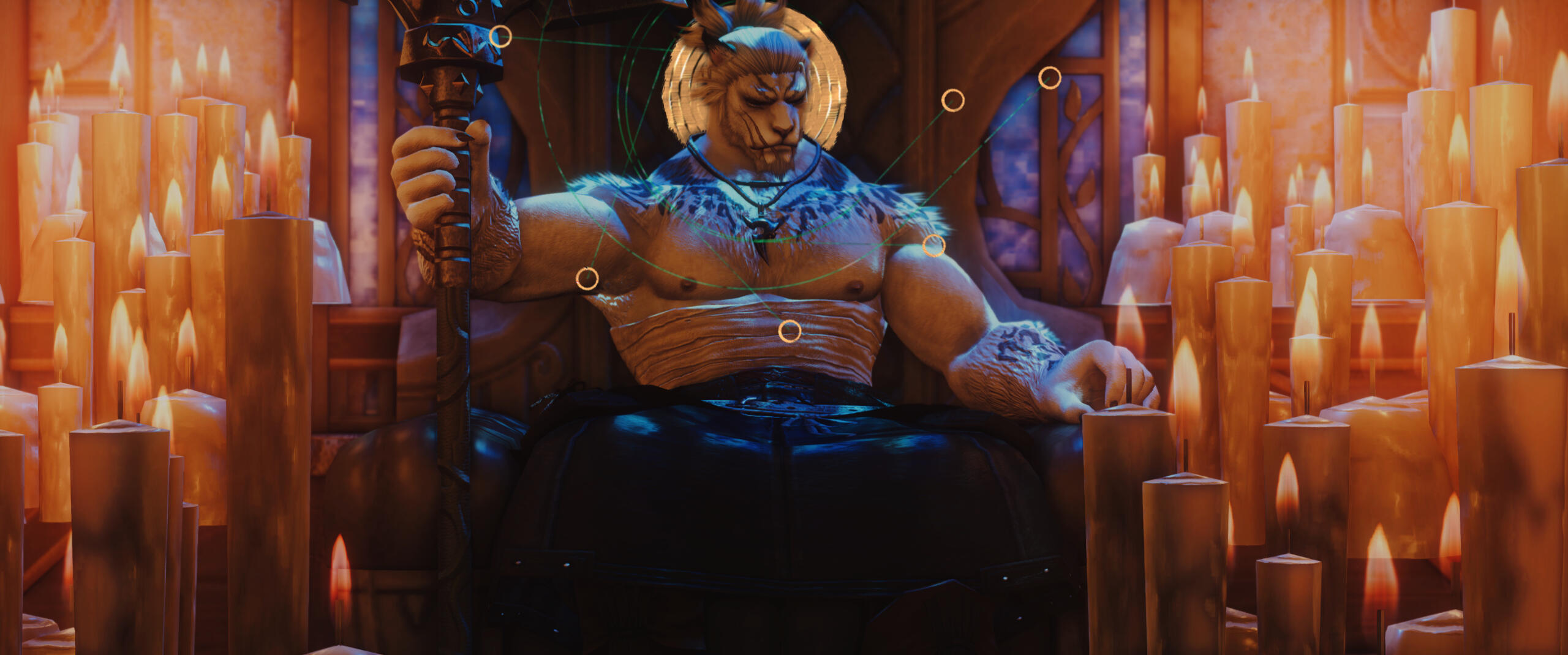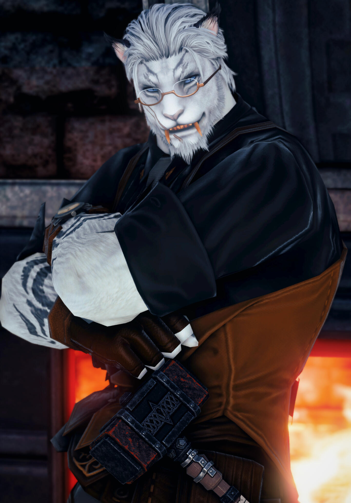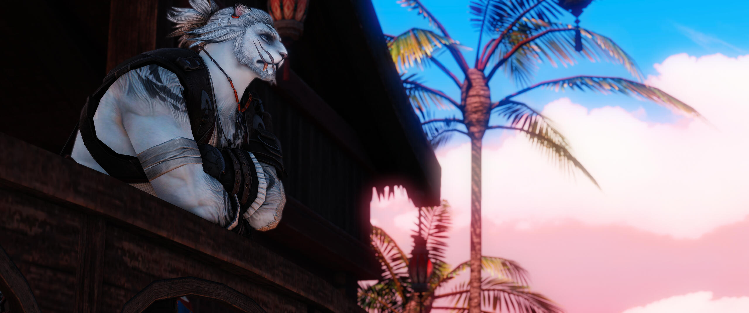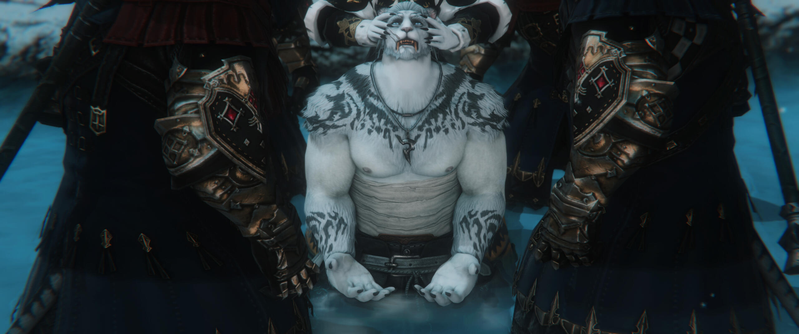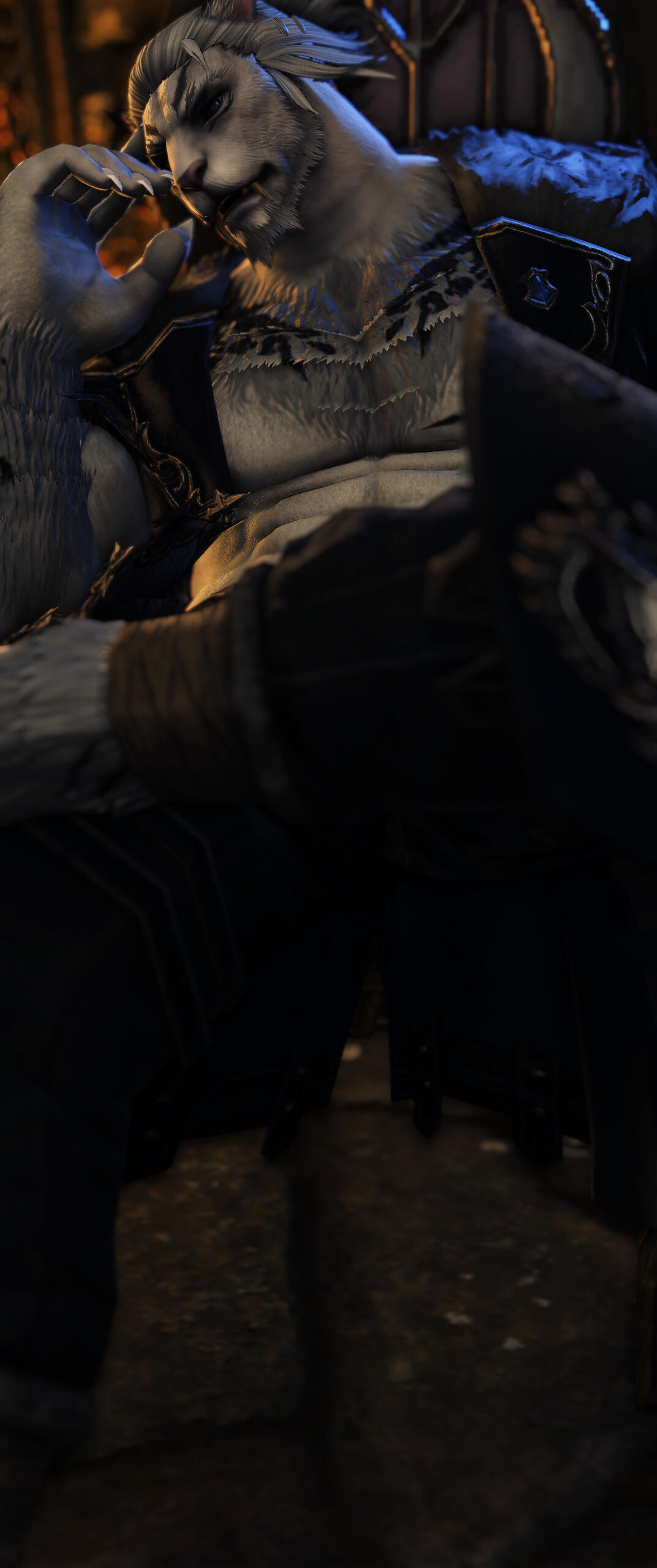 The Hrothgar standing in front of you carries himself with resolve. Like all of his kith, the man has built himself to be resilient throughout the years of traveling the northern mountain paths, off-road slopes, and the treacherous landscapes of Ilsabard and beyond.Spending the majority of his time with his Father and Brother. He joined Zeljko in tending to the resident settlements that were sparse across the frigid peaks. Learning his Father's craft, and his experience with the Axe.Though most of this musculature would be hidden beneath his rugged snow-white fur, the dark grey contrasting pattern wraps along his arms, shoulders, and forearms. Mithgar emanates a gentle aura in the presence of people that is most pure; A stoic but gentle giant.